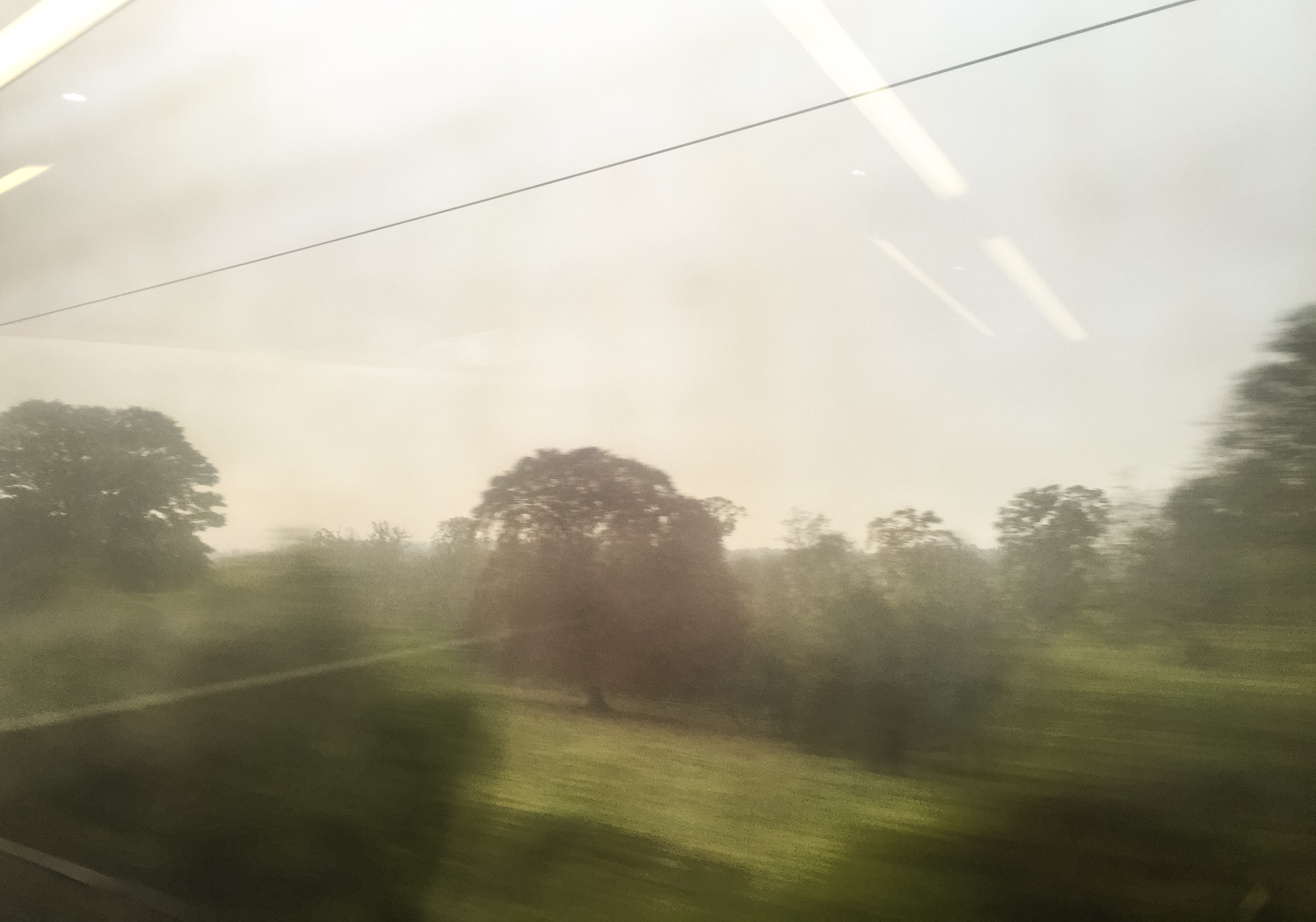 Few people on the train are gazing out of the windows, for me that is one of the pleasures of a train journey. There’s a background of papers rustling, keyboards being tapped and a bit of screen time. The landscape leaving a foggy Derby station is modest, hardly a compelling view, but there’s nature to be found in the form of scrubby hedgerows and trees, their remaining leaves hanging forlornly.