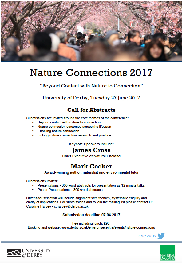 To inform and be part of the way forward come along to the next Nature Connections conference, once again hosted by the University of Derby on 27th June 2017. Details of the call for papers and booking available from the conference website.