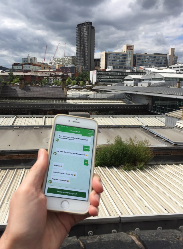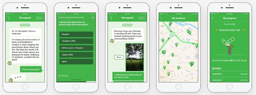 Primarily aimed at people who live in Sheffield (hence the ‘Sh’), the app also works elsewhere, reminding users daily for 30 days to notice and map the good things, letting people record, photograph and rate each one. This is done through a ‘conversation’ with the ‘chatbot’ called ‘Shmapbot’, your companion for the month. The smartphone is also used to track activity, allowing us to get some really rich and useful data.