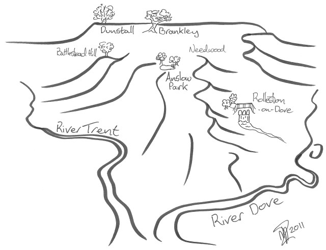 One of the first things I did when I was renewing my relationship with the rest of the natural world was draw a map to understand the local landscape. To strip away the detail to reveal the bones of the landscape and places and features that had meaning fore me. Using the accuracy of OS maps as a guide I exaggerated the hills to match how they felt on the ground – steep! Rather than a vertical overview, I created a viewpoint that looked towards my home from high above the valley below. The map revealed a modest plateau between two rivers. When I think of my local landscape, I think in terms of my map and the simple context it provides.