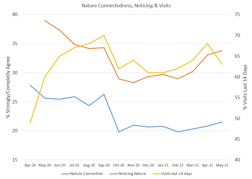 While it makes sense that attention may have shifted away from nature to people and other activities after being kept apart for so long, the chart shows we must not neglect our relationship with nature. Even though visits to green spaces have remained high, noticing and deeper connection to nature have faded – a visit to nature does not guarantee connection. Research has shown that taking time to notice nature is vital for nature connection, and simply noticing nature leads to greater mental wellbeing for humans – and nature too. It’s important to pause and find moments to tune into the sounds, sights, smells and beauty of nature to foster our relationship with it.