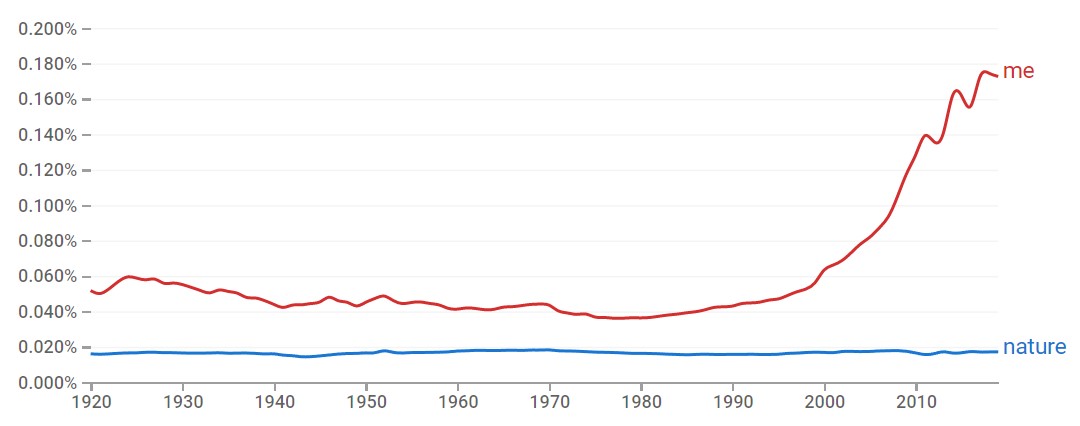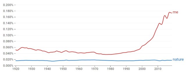 Usage of ‘nature’ and ‘me’ – Google Ngram Viewer: ‘[nature]’, ‘[Nature]’, ‘[NATURE]’, ‘[me]’, 1920-2019 in English.