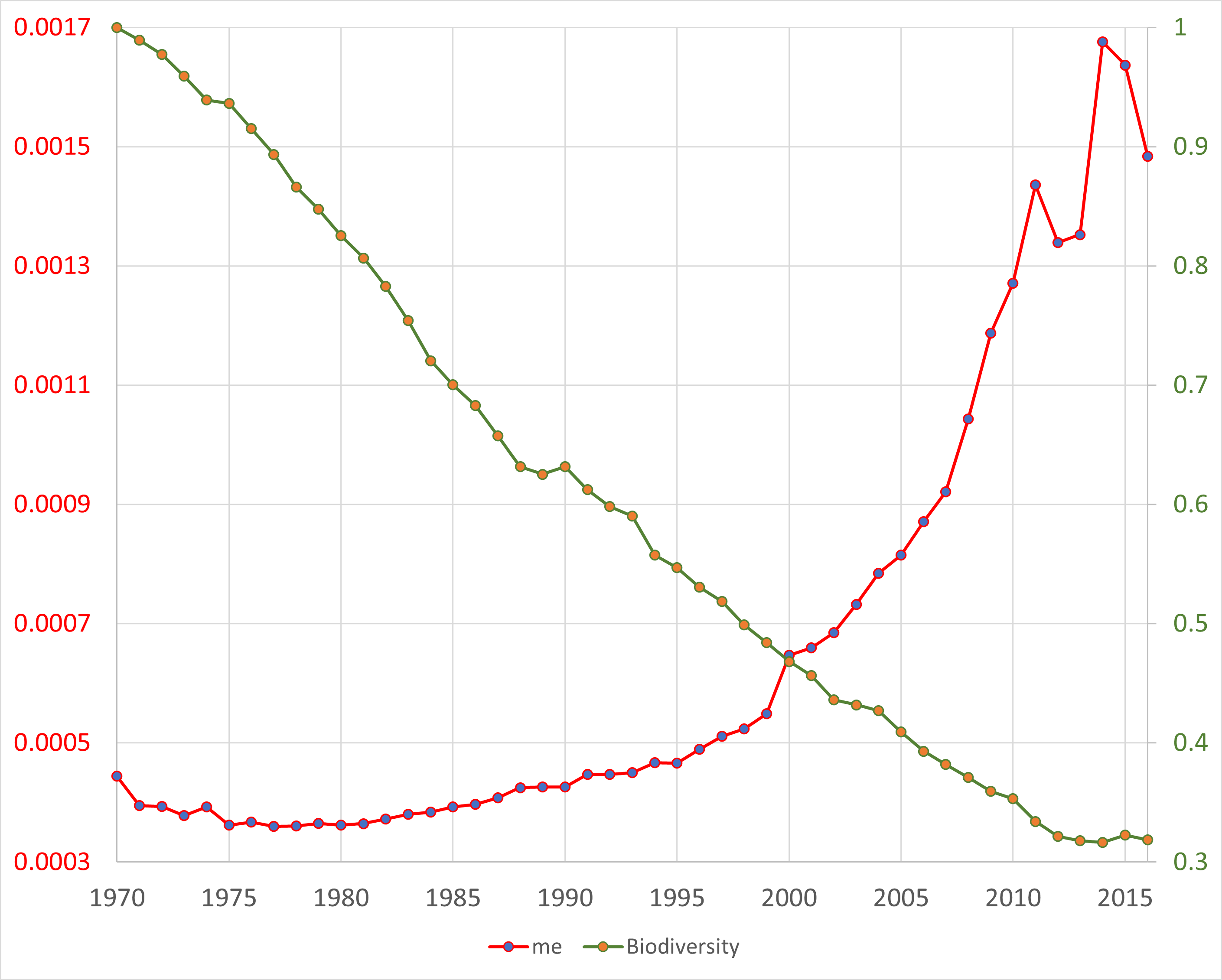The decline of biodiversity and rise of ‘me’ since 1970. Data: Living Planet Index http://stats.livingplanetindex.org/ – Google Ngram Viewer: ‘[me]’, 1970-2016 in English.