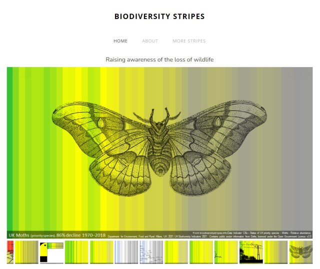 The biodiversity stripes have been so popular they now have their own home at biodiversitystripes.info which aims to raise awareness of the loss of wildlife. The new site also provides some new stripes based on UK data for priority species, moths and farmland birds. Measuring and indicating biodiversity is very complex, which can make telling a simple story about the loss of wildlife difficult, but there is an urgent need to make the problem visible. People need to be aware for change to happen.