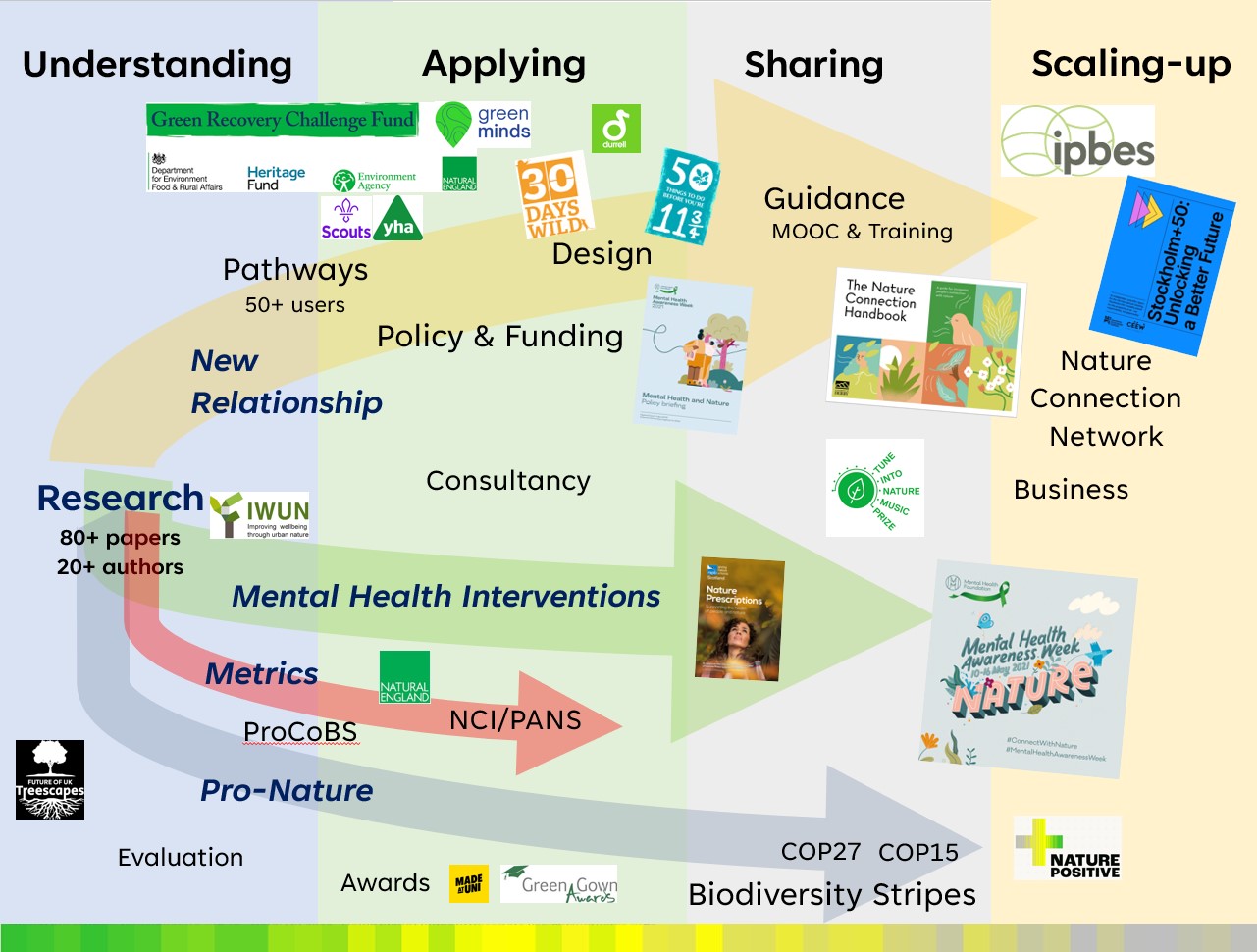 Our nature connection focussed interventions have led to clinically significant improvements in mental health, with the research informing policy briefings, green social prescription schemes and the Mental Health Foundation’s 2021 Mental Health Awareness Week – the world’s largest mental health week campaign. Our ‘three good things in nature’ approach has part of a green prescription pilot run by RSPB Scotland. Our research also informs the work of Mind, again see our Nature Connection Handbook.