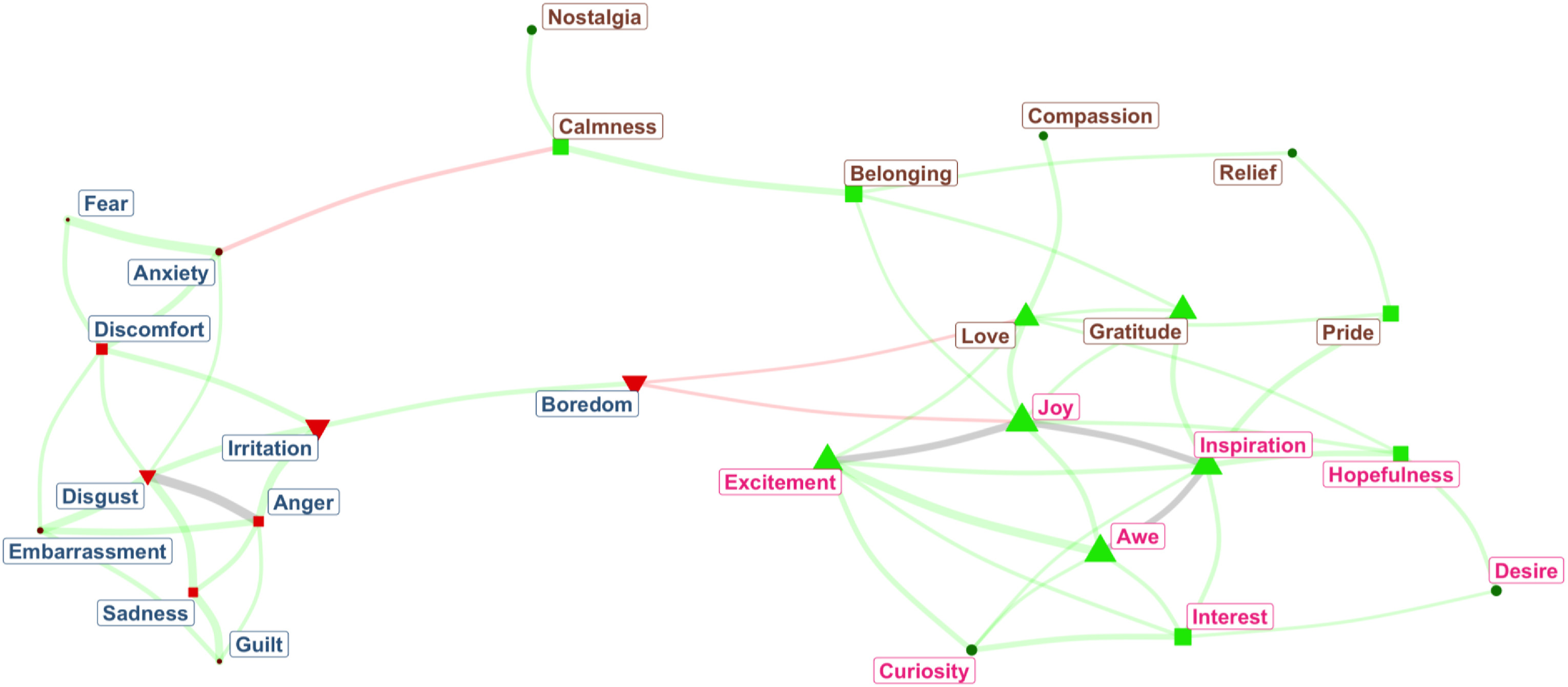 Further, the network also shows ‘centrality’. The three most positively central emotions were inspiration, love, and excitement. So, when inspiration, love, and excitement are present, many other positively influential emotions are likely to be present, and few negatively influential emotions are likely to be present (see this recent blog for more on love).