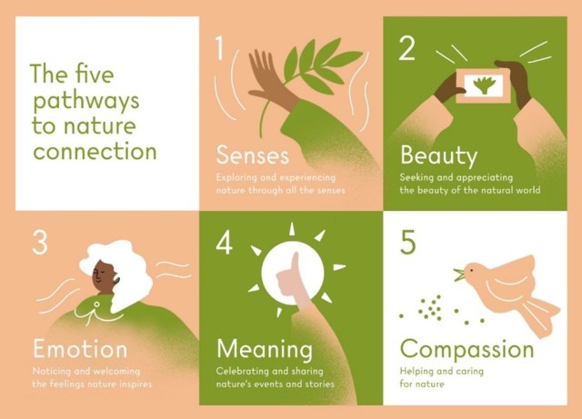 Although, I cannot disclose too much yet, I can say that the programme we have designed uses a self-led format. It adopts the five pathways to nature connection (see image below), giving people simple weekly activities that can be easily incorporated into their everyday lives, including at times which feel tough. All the activities are designed or adapted specifically for people with DE. Opportunity for choice is incorporated, including choice of the activities themselves but also when and where these are carried out. There is no need to travel anywhere special to perform the activities, they can be done in people’s gardens, balconies, local park etc. Some activities also have versions that can be carried out indoors. There are also invitations to reflect on experiences related to the programme. Centrally, this a very inclusive programme, that does not discriminate in terms of how severe someone’s DE symptoms are or how much experience they have in engaging and connecting with nature. It meets people where they are and welcomes everyone!