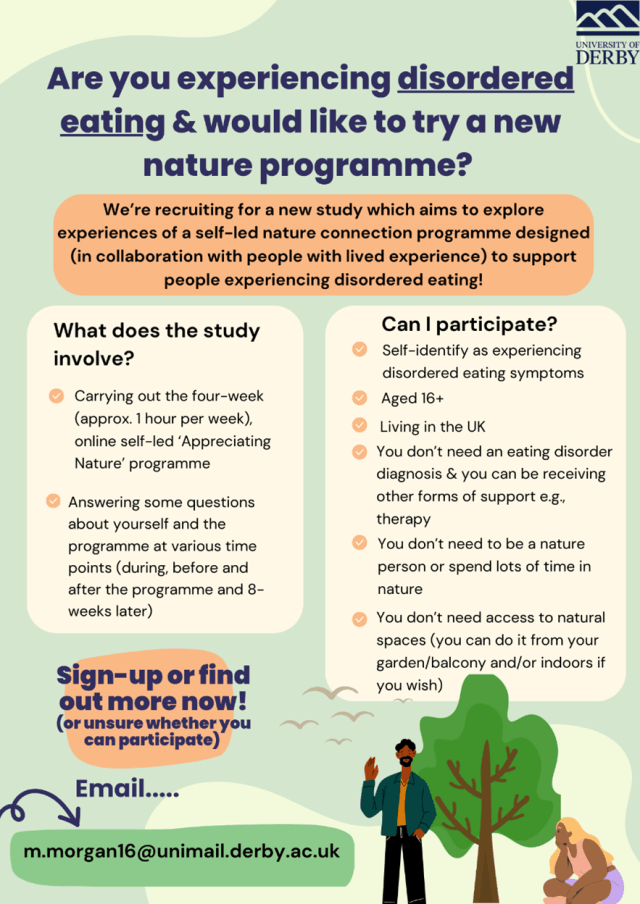 At the start of my PhD, I wrote a blog questioning the role nature connectedness could play in supporting people experiencing disordered eating (DE). I also outlined the ways I planned to develop a programme encouraging nature connection, specifically for people experiencing these symptoms. Two years on and I’m thrilled to have learnt about the wide range of ways nature connection can support this population and used this information to develop a prototype of the programme. This blog will briefly take you through this journey and then introduce some exciting opportunities for both people currently experiencing disordered eating and for professionals interested in incorporating nature into their DE services/practice.
