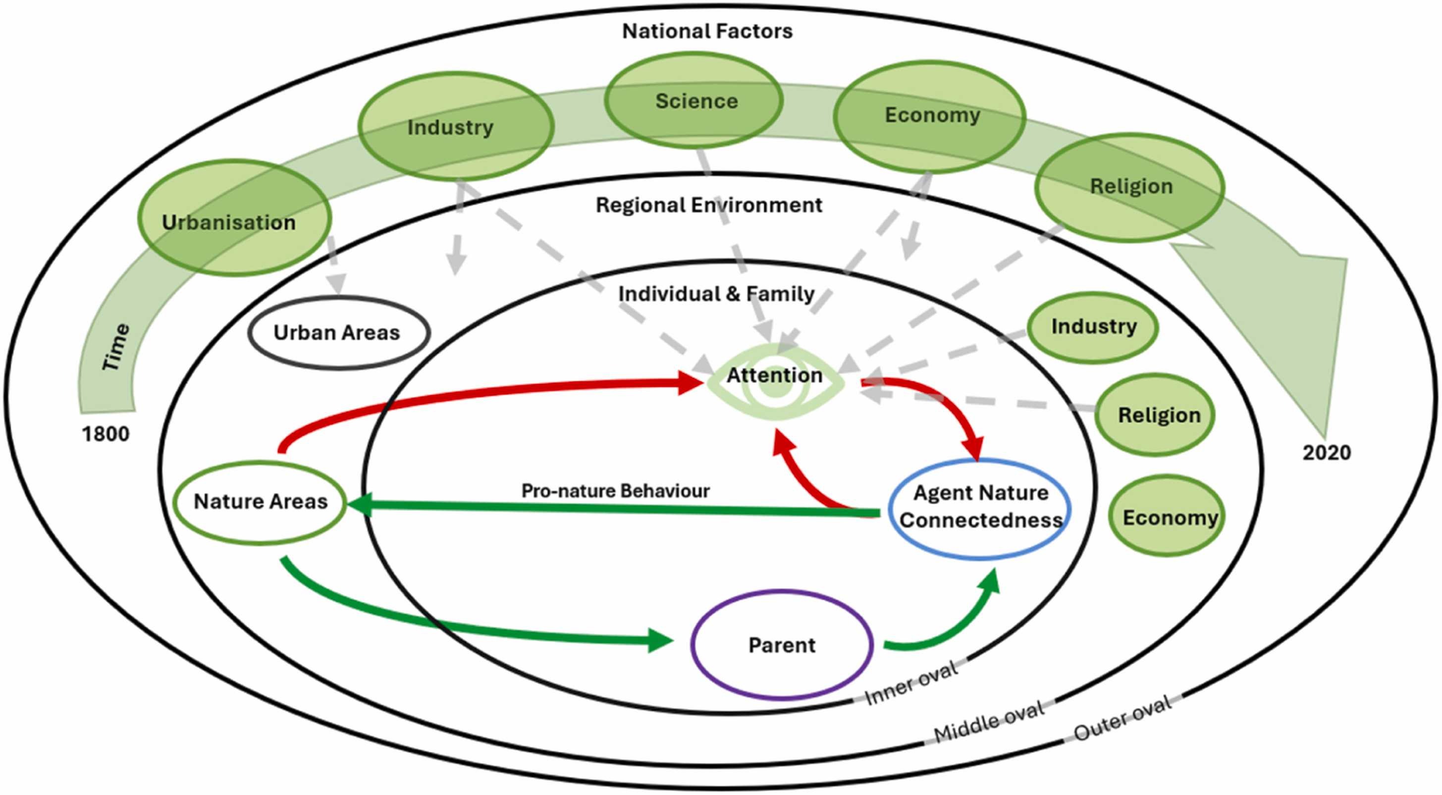 An individual’s nature connectedness changes through a balance of influences: the nature around them, their attention to it, and wider cultural and regional pressures. These interacting forces allow realistic long‑term trends to emerge from small, everyday experiences.
