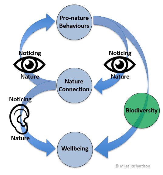 The results from this study also fit well with previous research and we’ve captured this in the figure below. The figure presents our previous findings that noticing nature is important for building nature connectedness, that nature connectedness is linked to improved wellbeing through noticing nature; that nature connectedness is linked to greater pro-nature behaviours through noticing and that the pro-nature behaviours that increase biodiversity are linked to improved wellbeing. The results above complete the reciprocal relationship between nature connectedness and pro-nature behaviours through noticing nature.