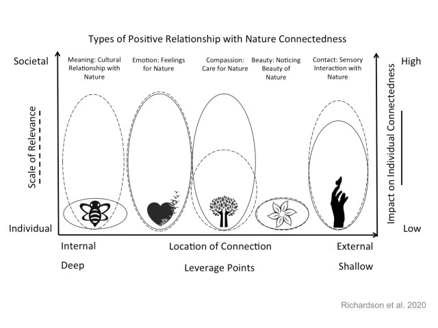 M. Richardson, J. Dobson, D. J. Abson, R. Lumber, A. Hunt, R. Young & B. Moorhouse (2020) Applying the pathways to nature connectedness at a societal scale: a leverage points perspective, Ecosystems and People, 16:1, 387-401, DOI: 10.1080/26395916.2020.1844296